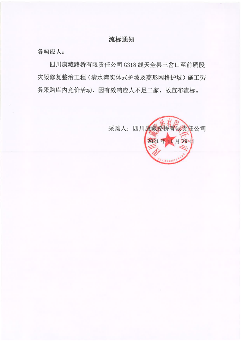 四川康藏路橋有限責(zé)任公司G318線天全縣三岔口至前碉段災(zāi)毀修復(fù)整治工程(清水灣實(shí)體式護(hù)坡及菱形網(wǎng)格護(hù)坡)施工勞務(wù)采購流標(biāo)通知