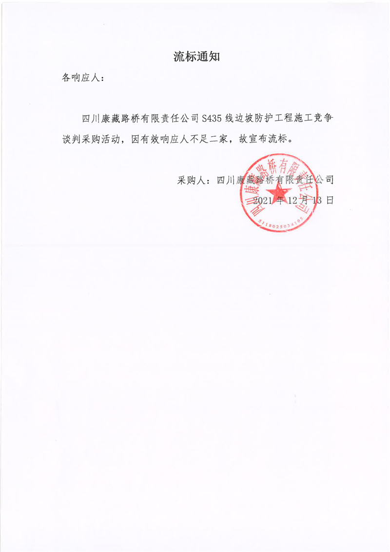 四川康藏路橋有限責(zé)任公司S435線邊坡防護(hù)工程施工采購流標(biāo)通知