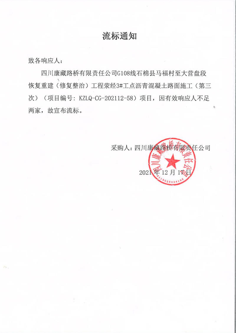 四川康藏路橋有限責任公司G108線石棉縣馬福村至大營盤段恢復(fù)重建(修復(fù)整治)工程滎經(jīng)3#工點瀝青混凝土路面施工(第三次)流標通知