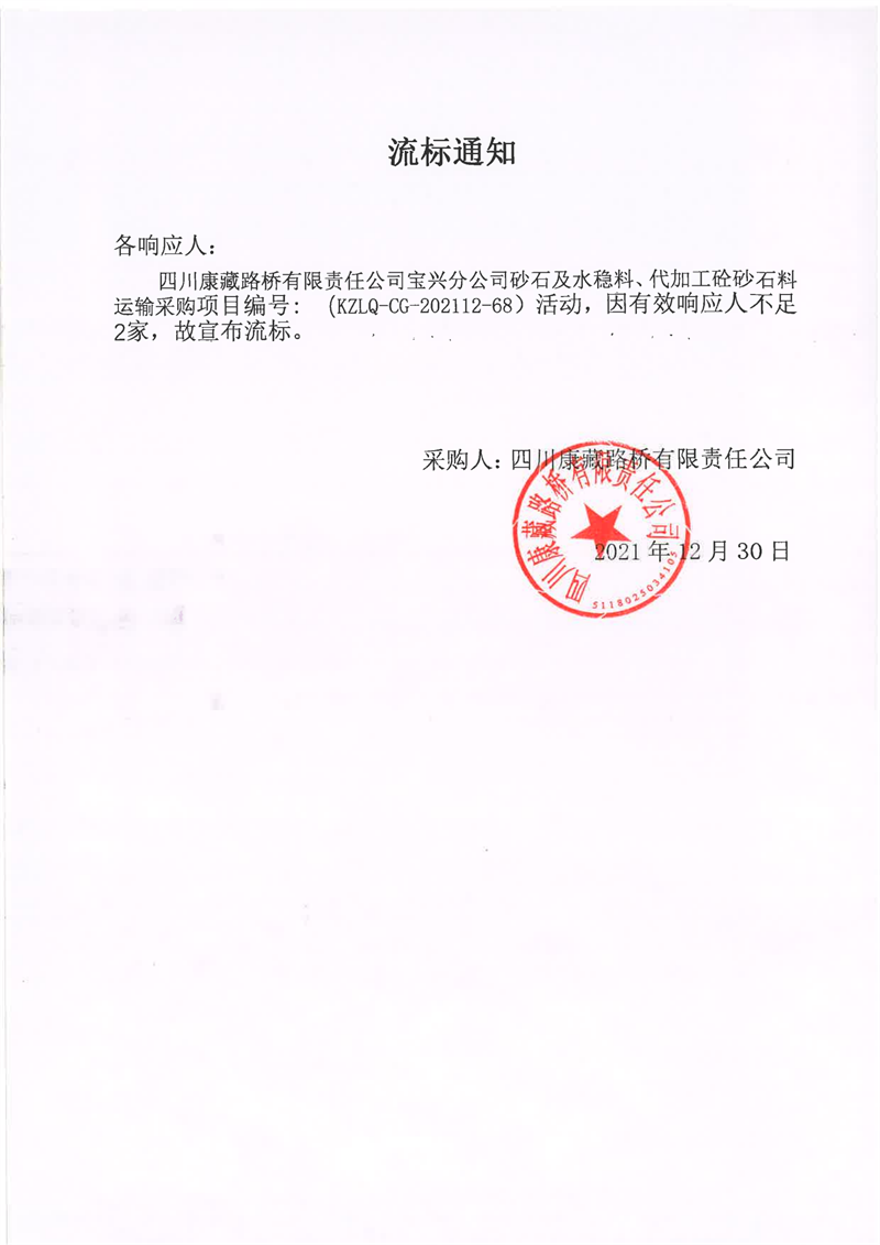 四川康藏路橋有限責任公司寶興分公司砂石及水穩(wěn)料、代加工砼砂石料運輸采購流標通知