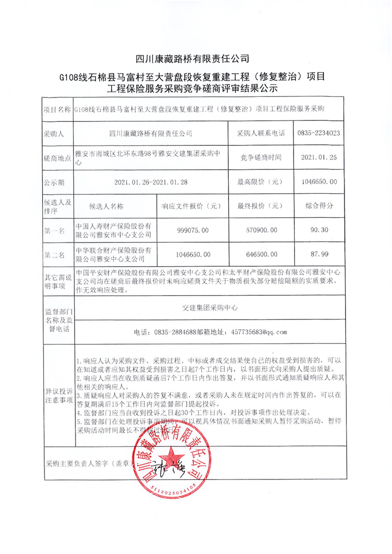 四川康藏路橋有限責(zé)任公司G108線石棉縣馬富村至大營盤段恢復(fù)重建工程(修復(fù)整治)項目工程保險服務(wù)采購競爭磋商評審結(jié)果公示