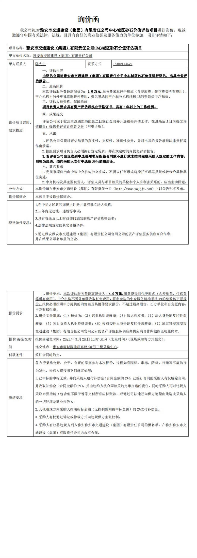 雅安市交通建設(shè)(集團(tuán))有限責(zé)任公司中心城區(qū)砂石價(jià)值評(píng)估項(xiàng)目詢價(jià)函