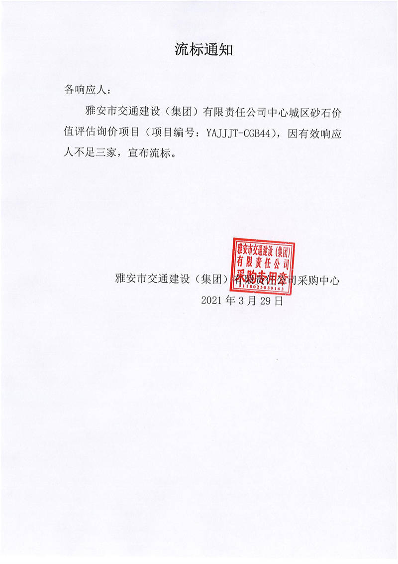雅安市交通建設(shè)(集團(tuán))有限責(zé)任公司中心城區(qū)砂石價(jià)值評估項(xiàng)目流標(biāo)通知