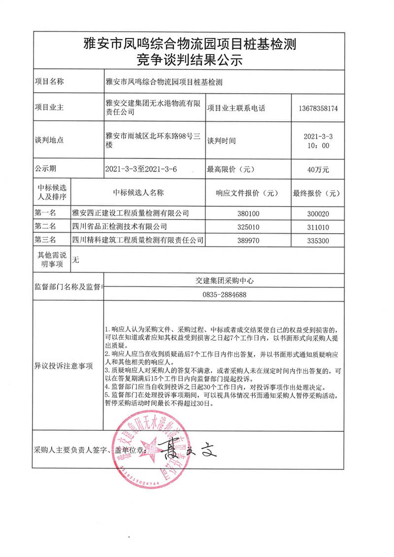 雅安交建集團(tuán)無水港物流有限責(zé)任公司雅安市鳳鳴綜合物流園項(xiàng)目樁基檢測(cè)競爭談判結(jié)果公示