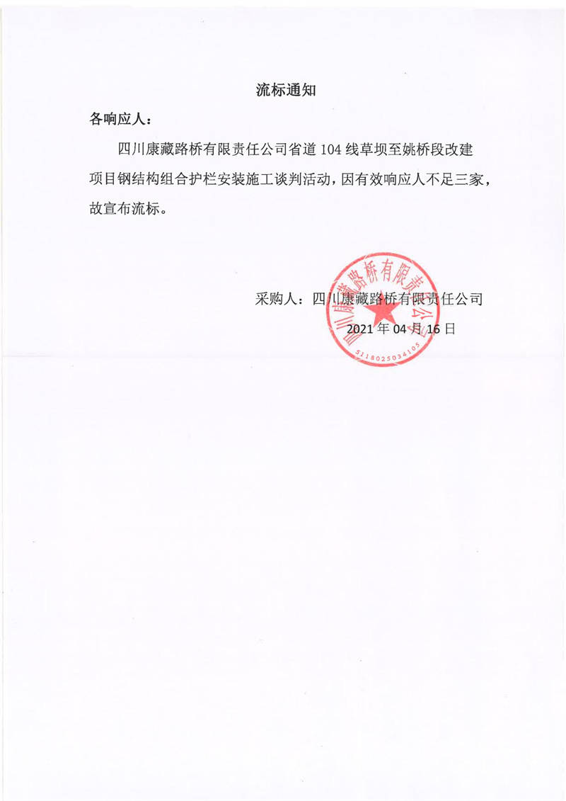 四川康藏路橋有限責(zé)任公司省道104線草壩至姚橋段改建項目鋼結(jié)構(gòu)組合護欄安裝施工流標(biāo)通知
