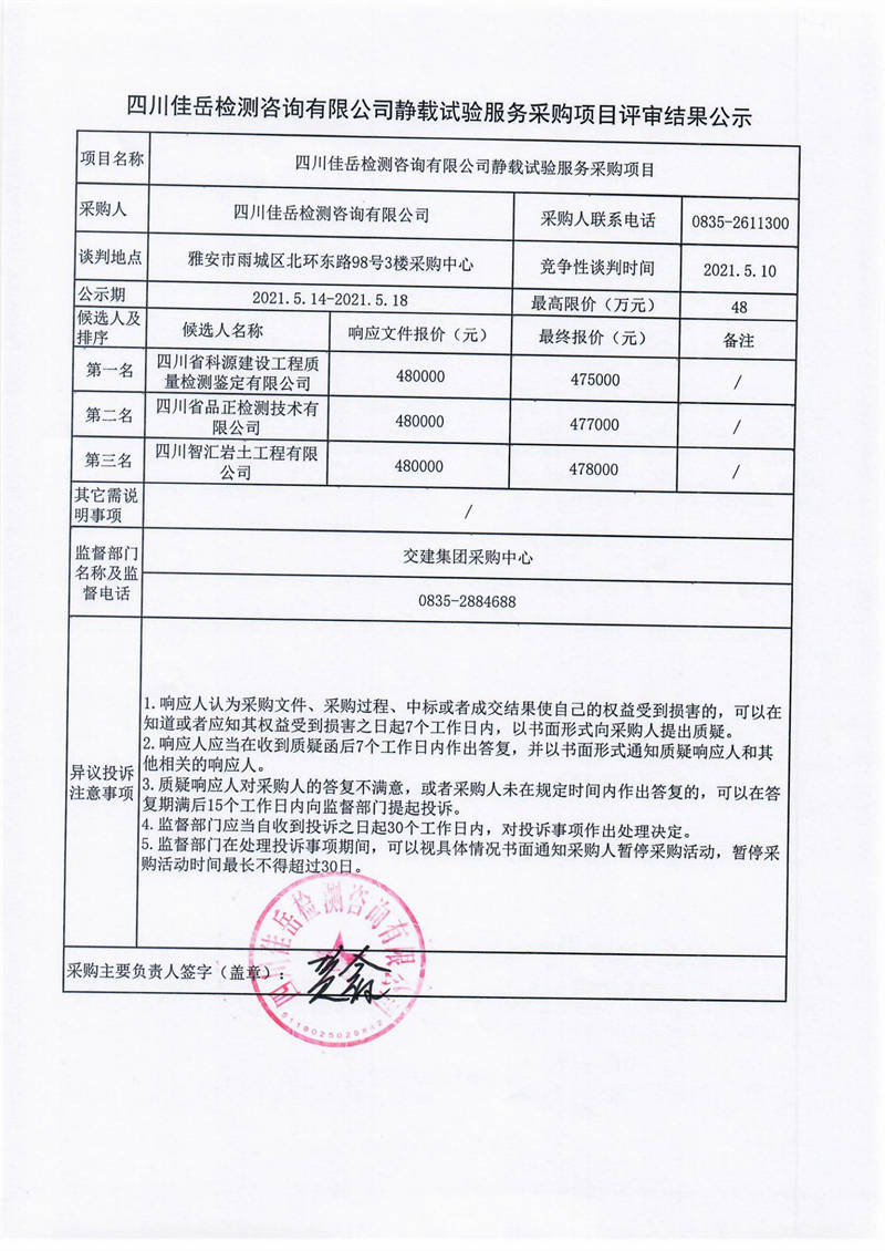 四川佳岳檢測(cè)咨詢有限公司靜載試驗(yàn)服務(wù)采購(gòu)項(xiàng)目評(píng)審結(jié)果公示