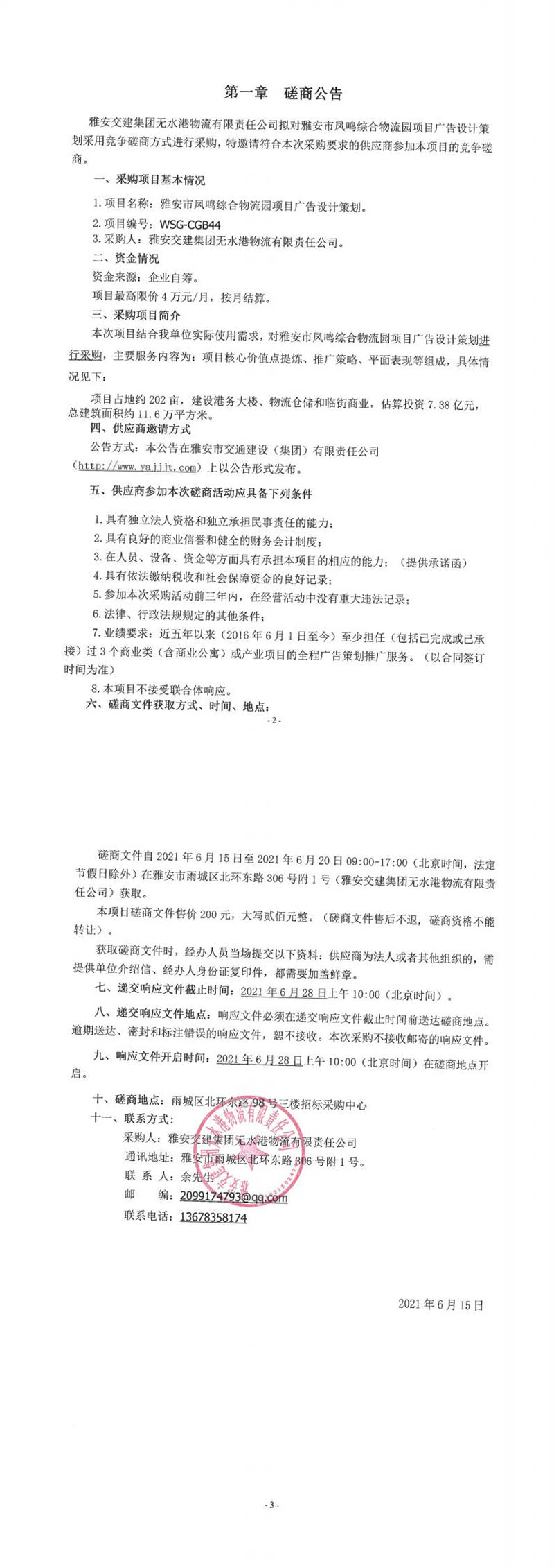 雅安交建集團無水港物流有限責任公司雅安市鳳鳴綜合物流園項目廣告設計策劃磋商公告