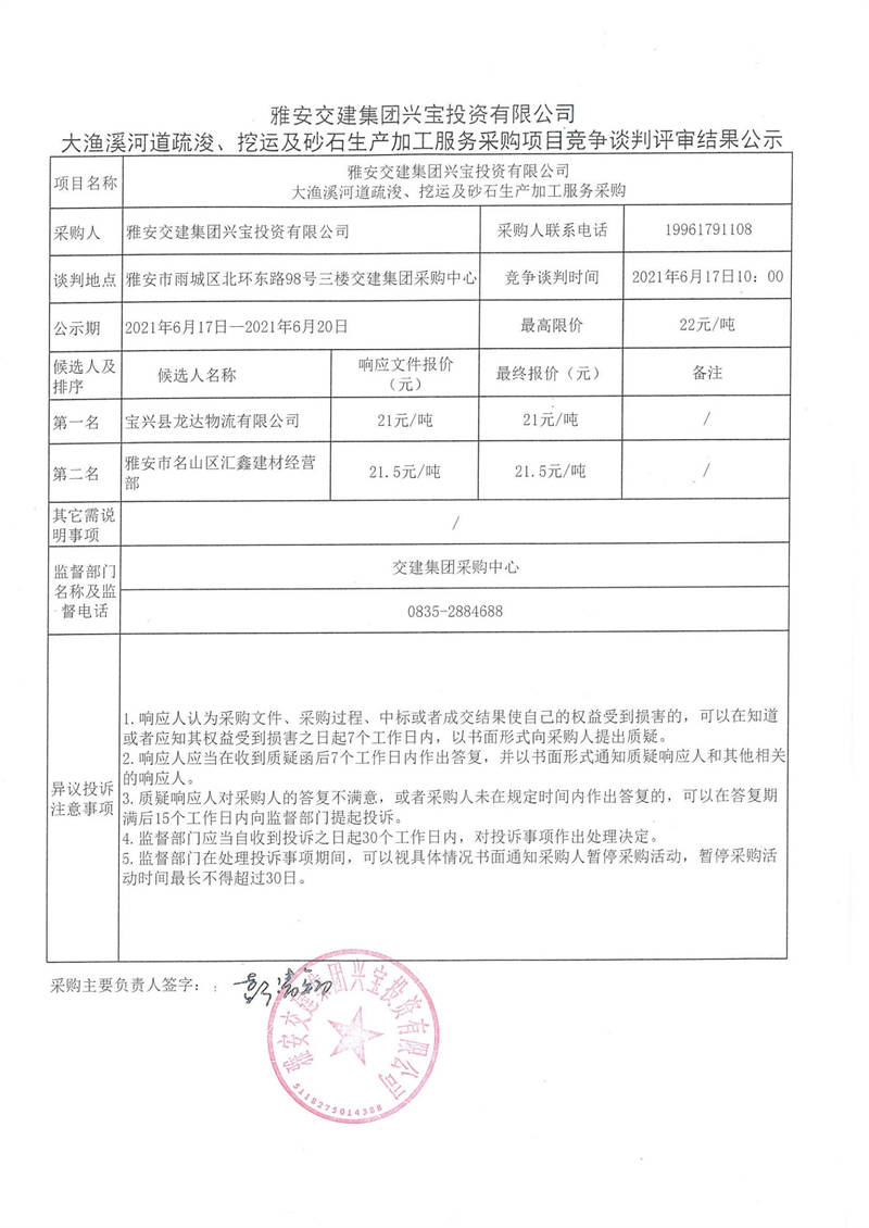 雅安交建集團(tuán)興寶投資有限公司大漁溪河道疏浚、挖運(yùn)及砂石生產(chǎn)加工服務(wù)采購(gòu)項(xiàng)目競(jìng)爭(zhēng)談判評(píng)審結(jié)果公示