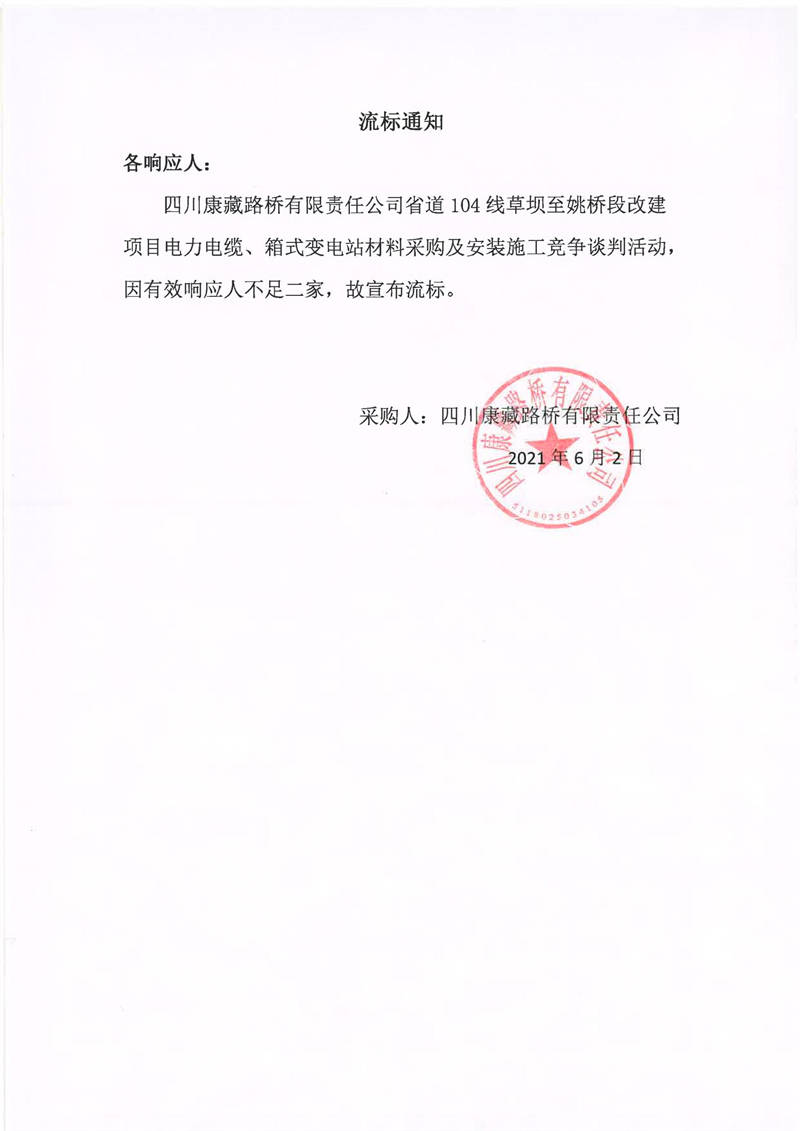 四川康藏路橋有限責(zé)任公司省道104線草壩至姚橋段改建項目電力電纜、箱式變電站材料采購及安裝施工競爭談判流標通知