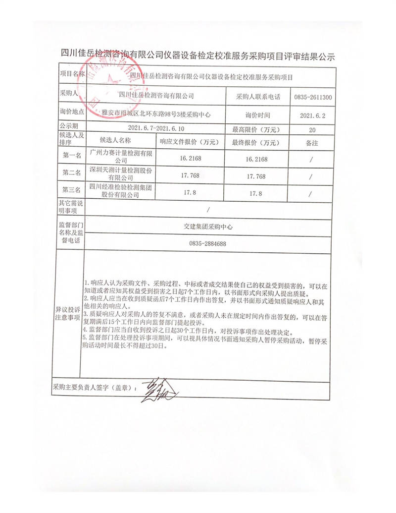 四川佳岳檢測咨詢有限公司儀器設(shè)備檢定校準(zhǔn)服務(wù)采購項目評審結(jié)果公示