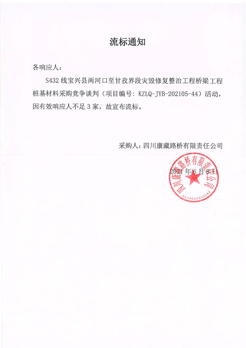 四川康藏路橋有限責(zé)任公司S432線寶興縣兩河口至甘孜界段災(zāi)毀修復(fù)整治工程橋梁工程樁基材料采購競爭談判流標(biāo)通知