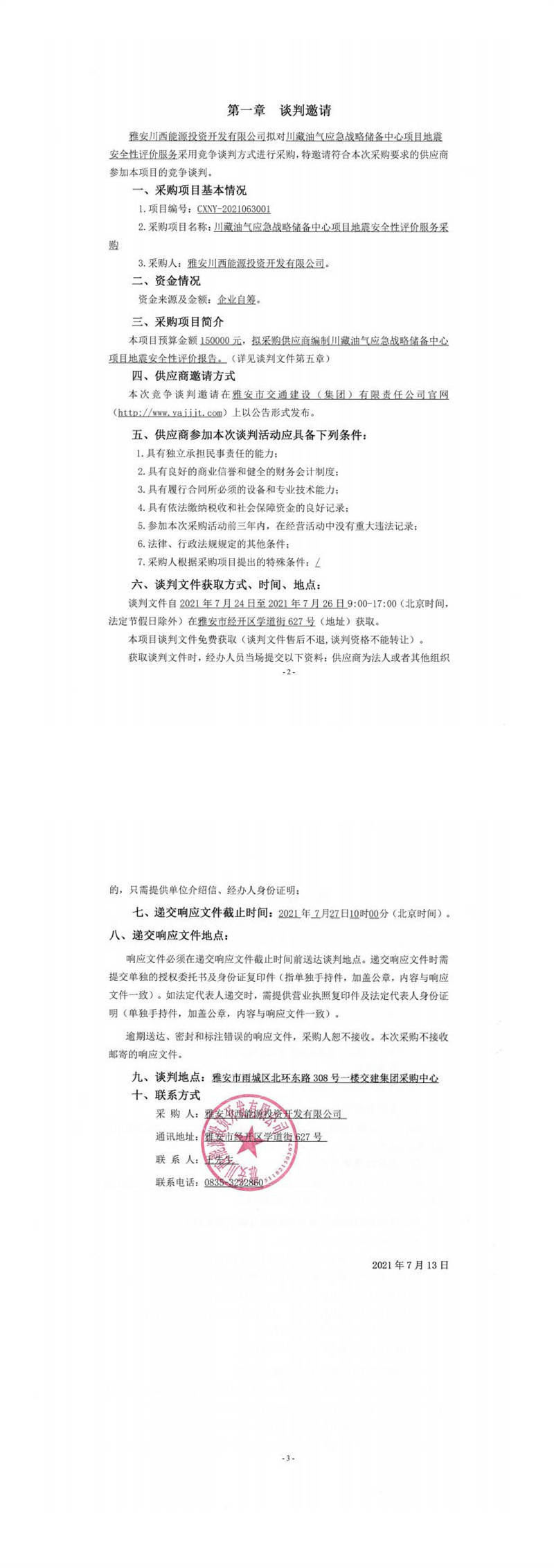 雅安川西能源投資開發(fā)有限公司川藏油氣應(yīng)急戰(zhàn)略儲(chǔ)備中心項(xiàng)目地震安全性評(píng)價(jià)服務(wù)采購競(jìng)爭(zhēng)談判公告