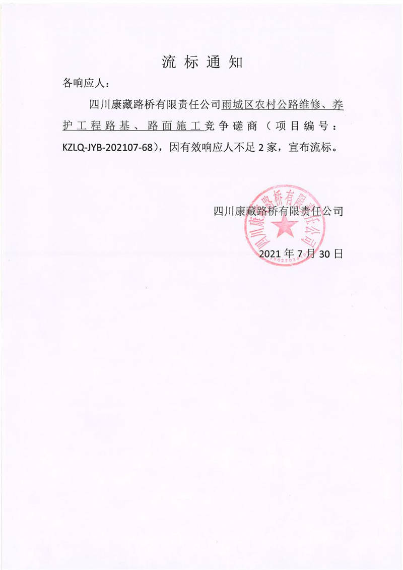 四川康藏路橋有限責(zé)任公司雨城區(qū)農(nóng)村公路維修、養(yǎng)護(hù)工程路基、路面施工競爭磋商流標(biāo)通知