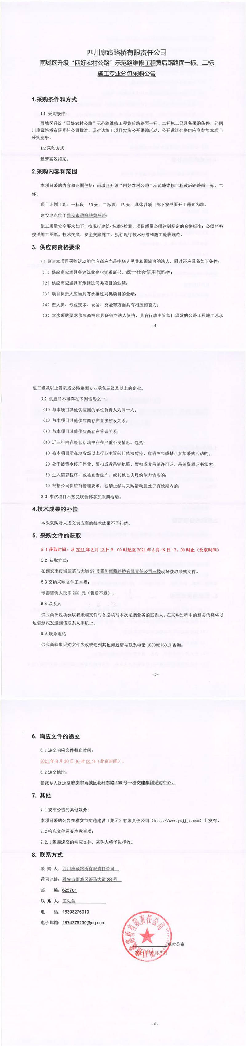 四川康藏路橋有限責(zé)任公司雨城區(qū)升級“四好農(nóng)材公路”示范路維修工程黃后路路面一標(biāo)、二標(biāo)施工專業(yè)分包采購公告