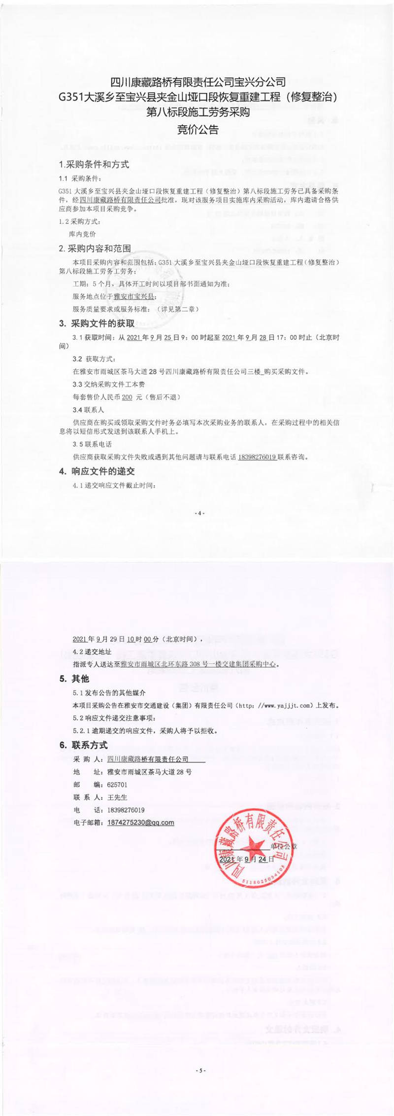 四川康藏路橋有限責(zé)任公司寶興分公司G351大溪鄉(xiāng)至寶興縣夾金山埡口段恢復(fù)重建工程(修復(fù)整治)第八標(biāo)段施工勞務(wù)采購競價公告
