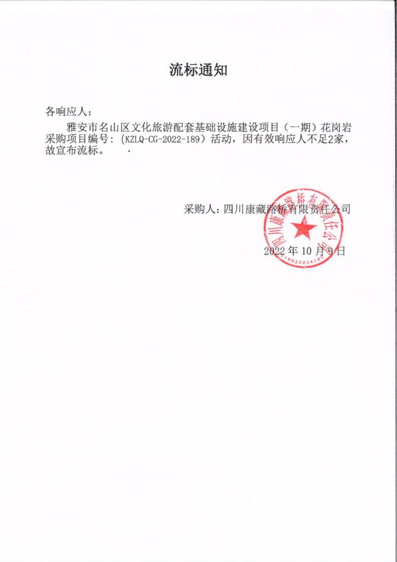 四川康藏路橋有限責(zé)任公司雅安市名山區(qū)文化旅游配套基礎(chǔ)設(shè)施建設(shè)項(xiàng)目(一期)花崗巖采購項(xiàng)目流標(biāo)通知