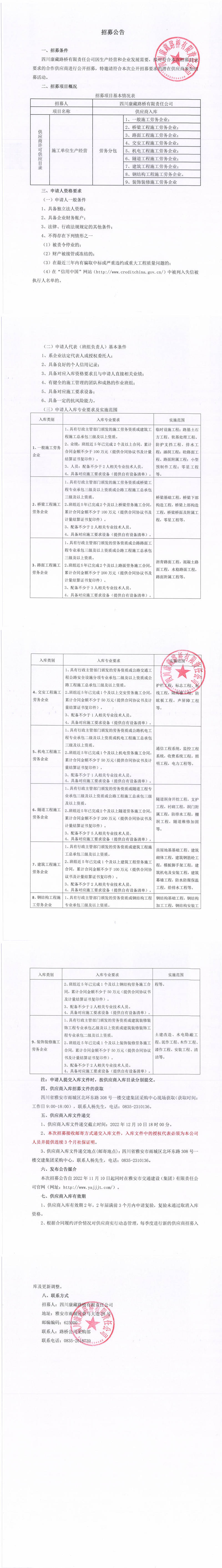 四川康藏路橋有限責任公司2022年第四季度供應商入庫招募公告