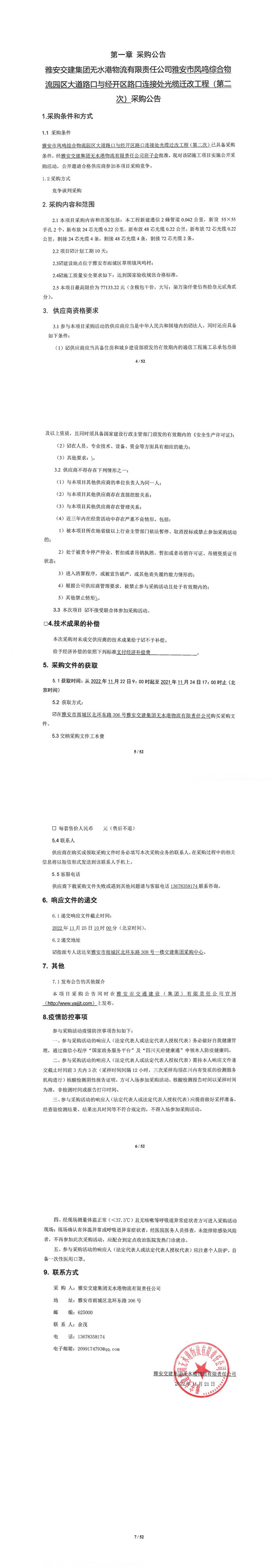 雅安交建集團(tuán)無(wú)水港物流有限責(zé)任公司雅安市鳳鳴綜合物流園區(qū)大道路口與經(jīng)開(kāi)區(qū)路口連接處光纜遷改工程(第二次)采購(gòu)公告