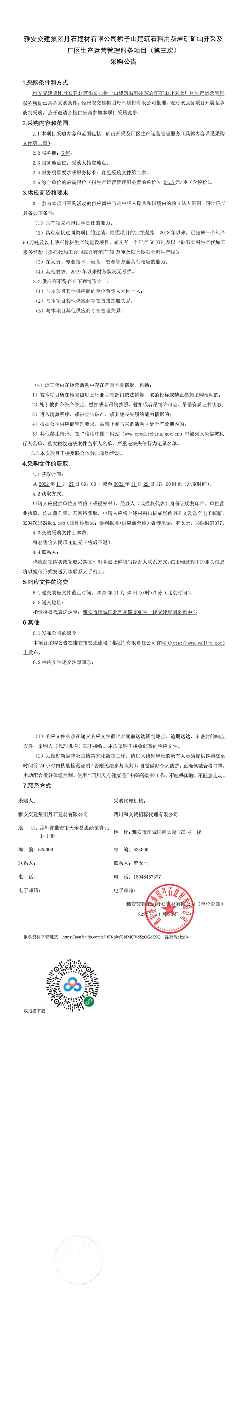 雅安交建集團丹石建材有限公司獅子山建筑石料用灰?guī)r礦礦山開采及廠區(qū)生產(chǎn)運營管理服務(wù)項目(第三次)采購公告