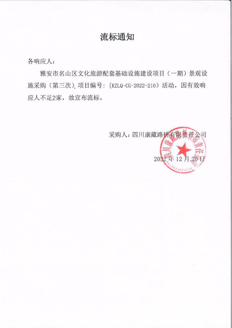四川康藏路橋有限責(zé)任公司雅安市名山區(qū)文化旅游配套基礎(chǔ)設(shè)施建設(shè)項(xiàng)目(一期)景觀設(shè)施采購(第三次)流標(biāo)通知