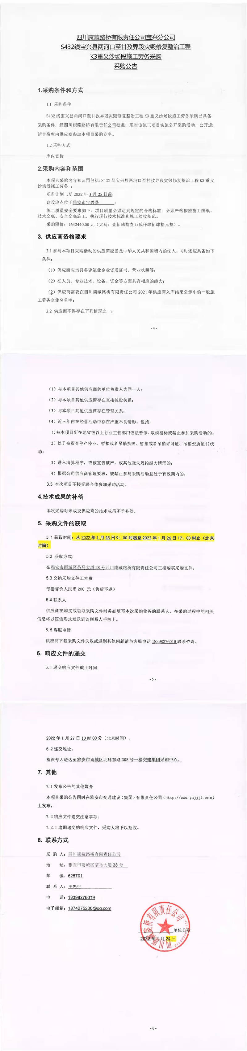 四川康藏路橋有限責(zé)任公司寶興分公司S432線寶興縣兩河口至甘孜界段災(zāi)毀修復(fù)整治工程K3重義沙場段施工勞務(wù)采購采購公告