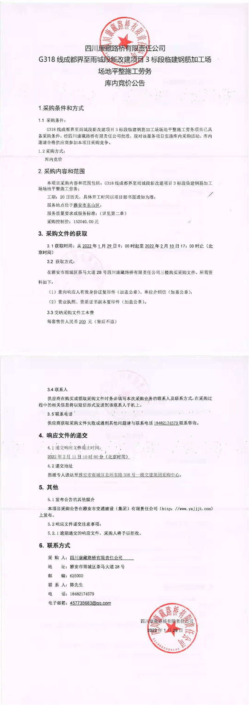 四川康藏路橋有限責任公司G318線成都界至雨城段新改建項目3標段臨建鋼筋加工場場地平整施工勞務(wù)庫內(nèi)競價公告