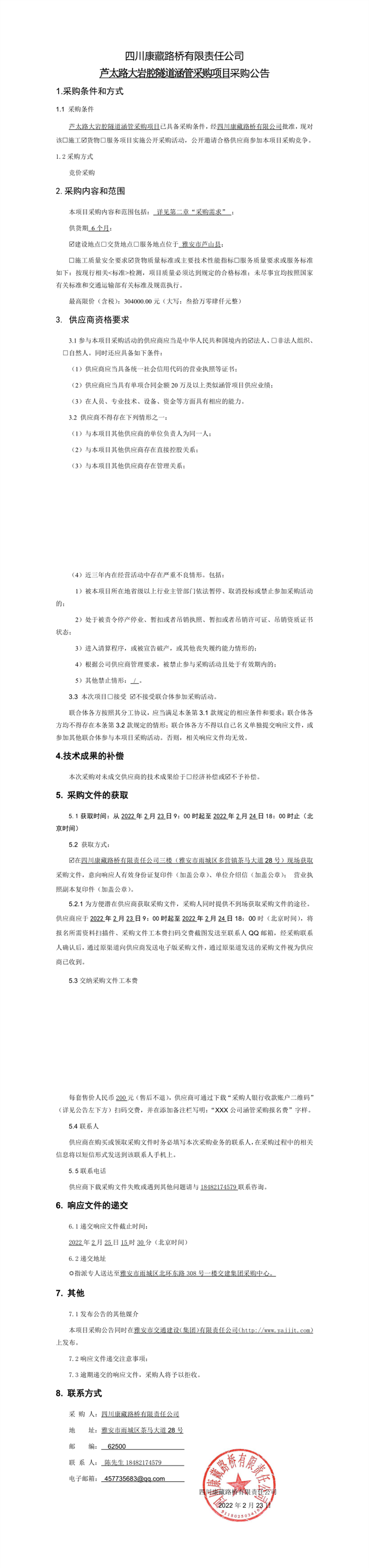 四川康藏路橋有限責(zé)任公司蘆太路大巖腔隧道涵管采購(gòu)項(xiàng)目采購(gòu)公告