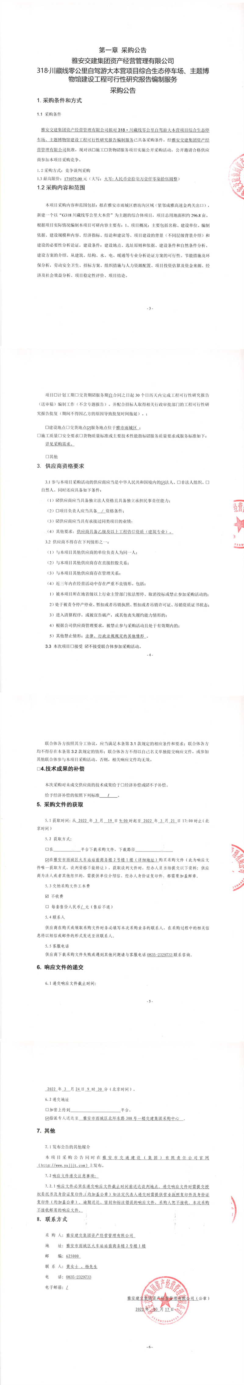 雅安交建集團(tuán)資產(chǎn)經(jīng)營管理有限公司318.川藏線零公里自駕游大本營項(xiàng)目綜合生態(tài)停車場(chǎng)、主題博物館建設(shè)工程可行性研究報(bào)告編制服務(wù)采購公告