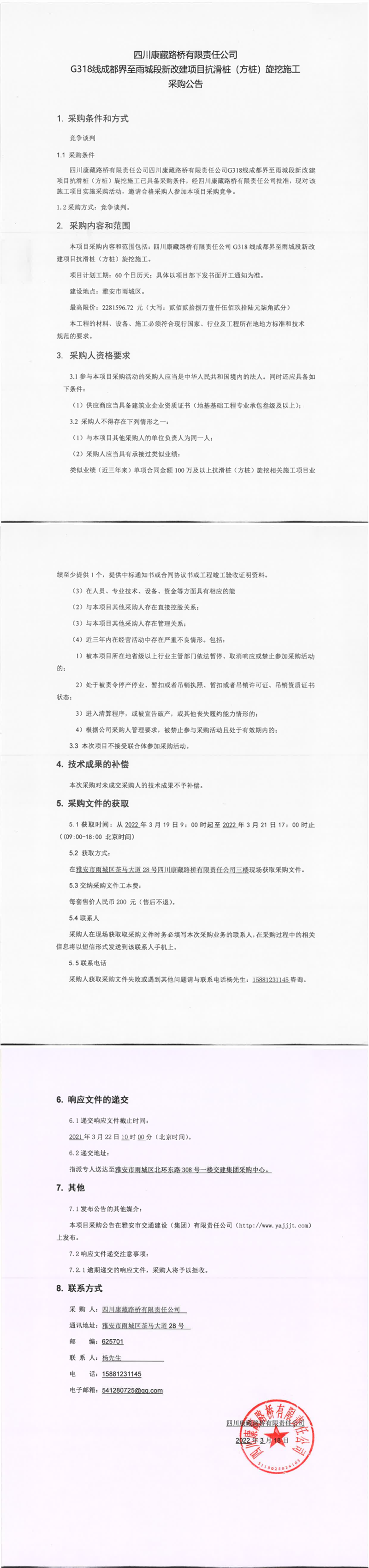 四川康藏路橋有限責(zé)任公司G318線成都界至雨城段新改建項(xiàng)目抗滑樁(方樁)旋挖施工采購(gòu)公告