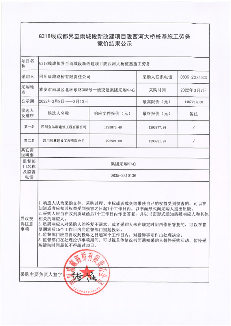 四川康藏路橋有限責(zé)任公司G318線成都界至雨城段新改建項目隴西河大橋樁基施工勞務(wù)競價結(jié)果公示