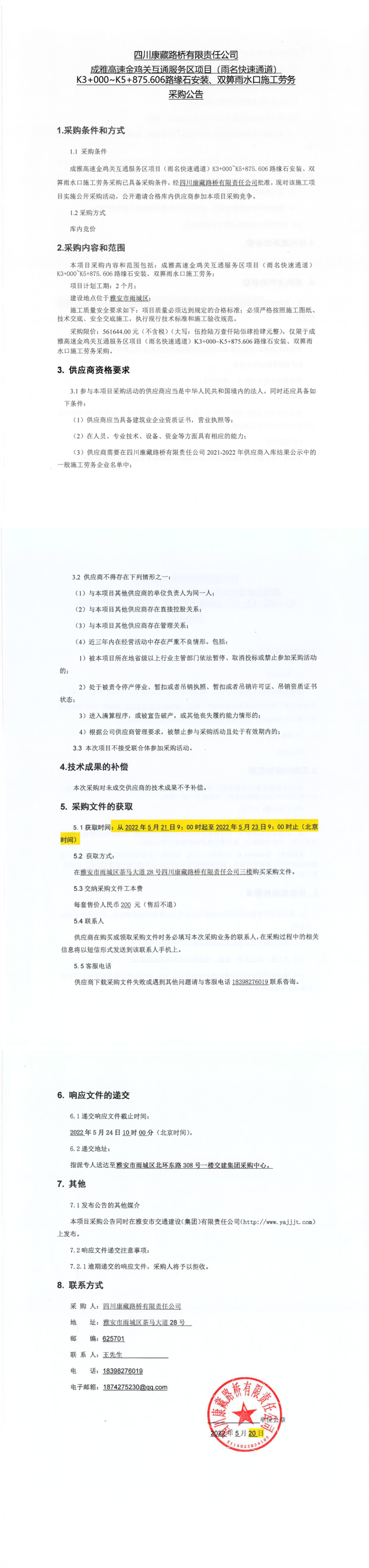 四川康藏路橋有限責任公司成雅高速金雞關互通服務區(qū)項目(雨名快速通道)K3+000-K5+875.606路緣石安裝、雙箅雨水口施工勞務采購公告