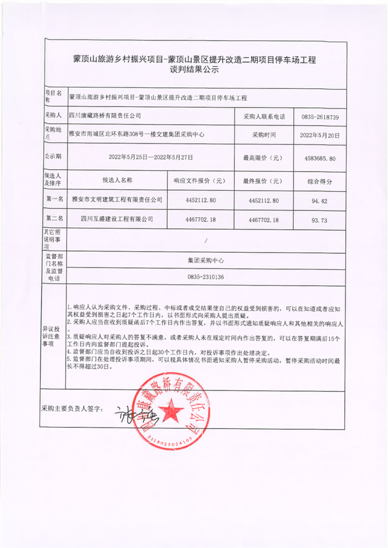 四川康藏路橋有限責(zé)任公司蒙頂山旅游鄉(xiāng)村振興項目-蒙頂山景區(qū)提升改造二期項目停車場工程談判結(jié)果公示