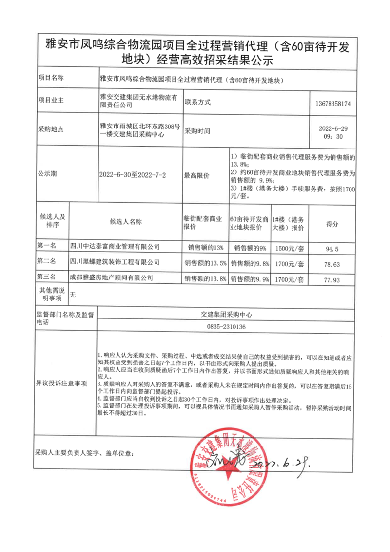雅安交建集團無水港物流有限責任公司雅安市鳳鳴綜合物流園項目全過程營銷代理(含60畝待開發(fā)地塊)經(jīng)營高效招采結(jié)果公示