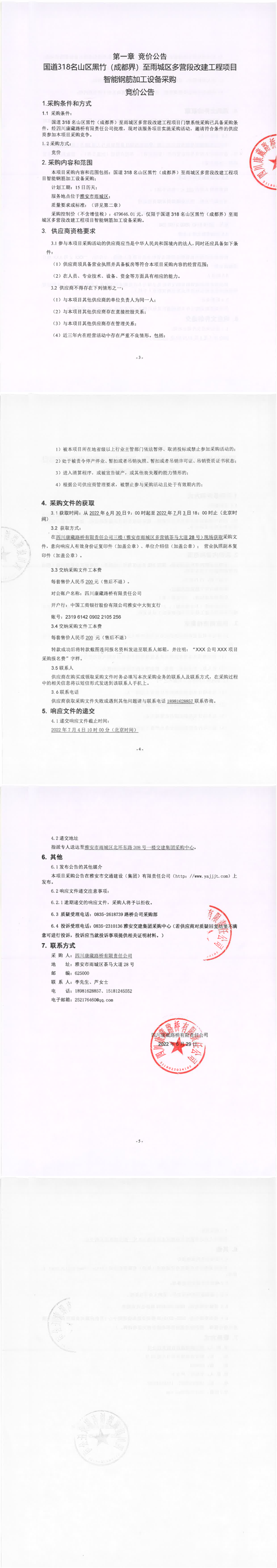 四川康藏路橋有限責(zé)任公司國道318名山區(qū)黑竹(成都界)至雨城區(qū)多營段改建工程項目智能鋼筋加工設(shè)備采購競價公告