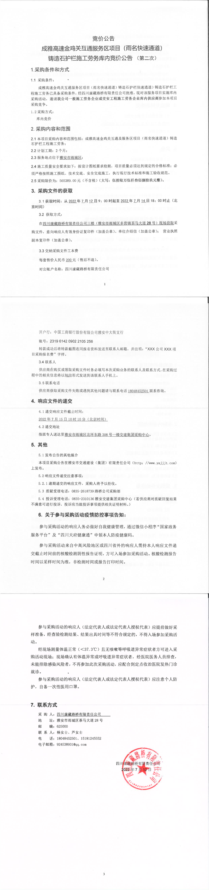 四川康藏路橋有限責(zé)任公司成雅高速金雞關(guān)互通服務(wù)區(qū)項(xiàng)目(雨名快速通道)鑄造石護(hù)欄施工勞務(wù)庫內(nèi)競價(jià)公告(第二次)