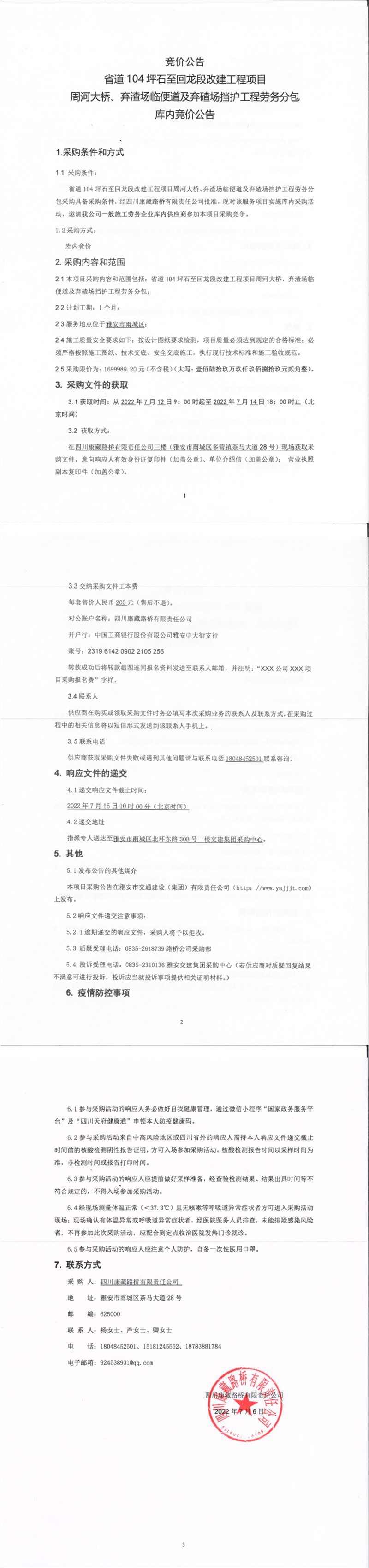 四川康藏路橋有限責任公司省道104坪石至回龍段改建工程項目周河大橋、棄渣場臨便道及棄碴場擋護工程勞務(wù)分包庫內(nèi)競價公告