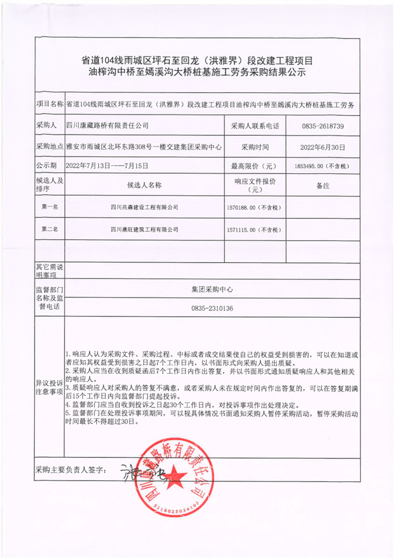 四川康藏路橋有限責(zé)任公司省道104線雨城區(qū)坪石至回龍(洪雅界)段改建工程項(xiàng)目油榨溝中橋至嫣溪溝大橋樁基施工勞務(wù)采購(gòu)結(jié)果公示
