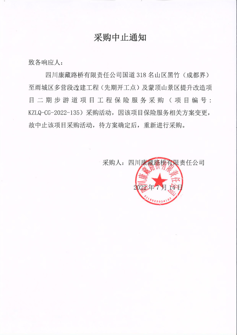 四川康藏路橋有限責任公司國道318名山區(qū)黑竹(成都界)至雨城區(qū)多營段改建工程(先期開工點)及蒙頂山景區(qū)提升改造項目二期步游道項目工程保險服務采購中止通知