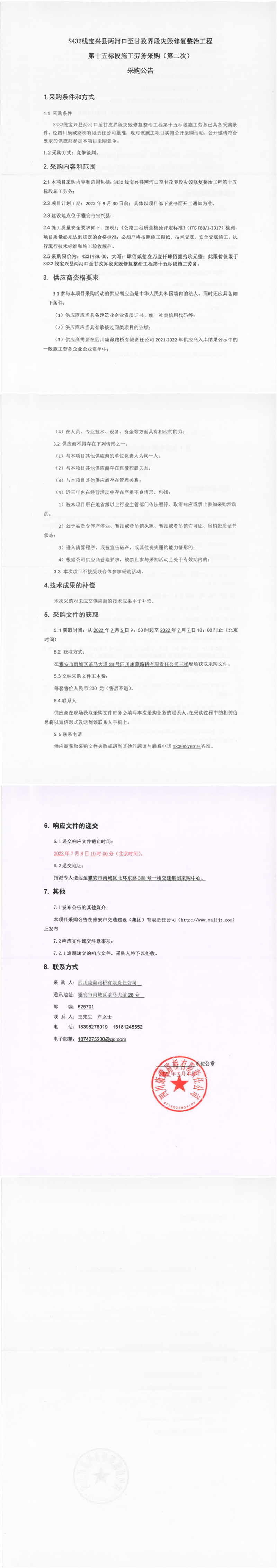 四川康藏路橋有限責(zé)任公司S432線寶興縣兩河口至甘孜界段災(zāi)毀修復(fù)整治工程第十五標(biāo)段施工勞務(wù)采購(第二次)采購公告