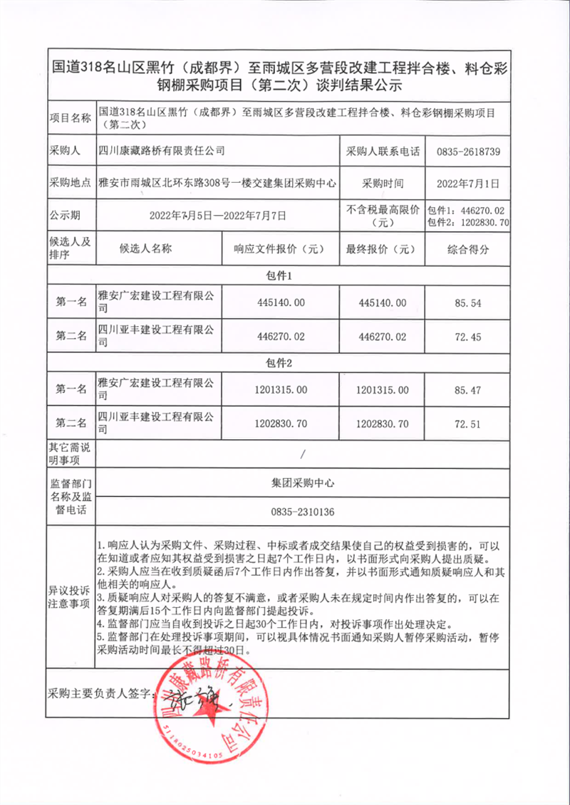 四川康藏路橋有限責(zé)任公司國(guó)道318名山區(qū)黑竹(成都界)至雨城區(qū)多營(yíng)段改建工程拌合樓、料倉(cāng)彩鋼棚采購(gòu)項(xiàng)目(第二次)談判結(jié)果公示