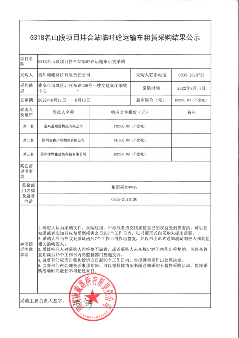 四川康藏路橋有限責(zé)任公司G318名山段項(xiàng)目拌合站臨時(shí)砼運(yùn)輸車租賃采購結(jié)果公示