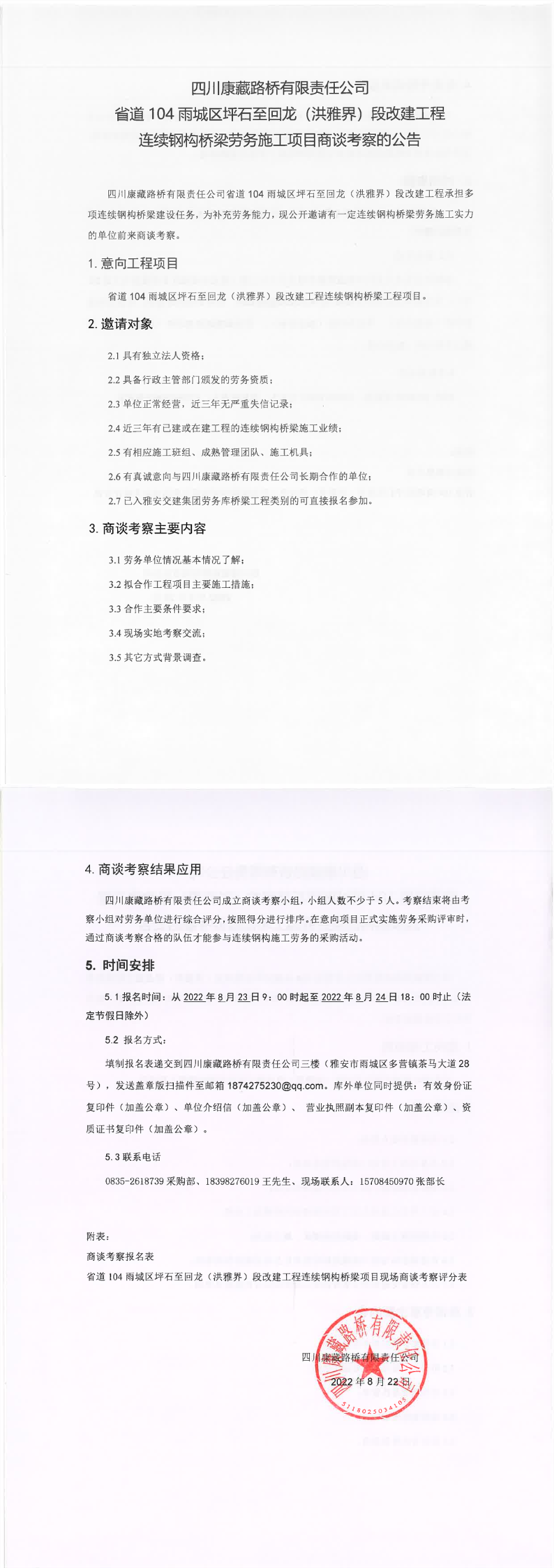 四川康藏路橋有限責任公司省道104雨城區(qū)坪石至回龍(洪雅界)段改建工程連續(xù)鋼構橋梁勞務施工項目商談考察的公告