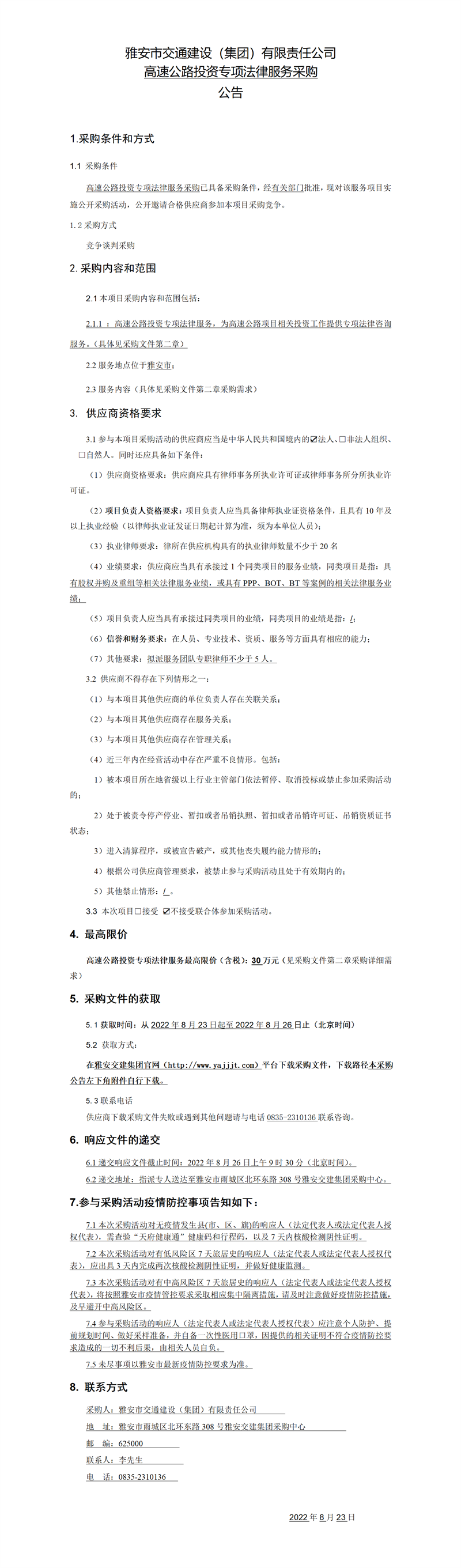 雅安市交通建設(shè)(集團(tuán))有限責(zé)任公司高速公路投資專項法律服務(wù)采購公告