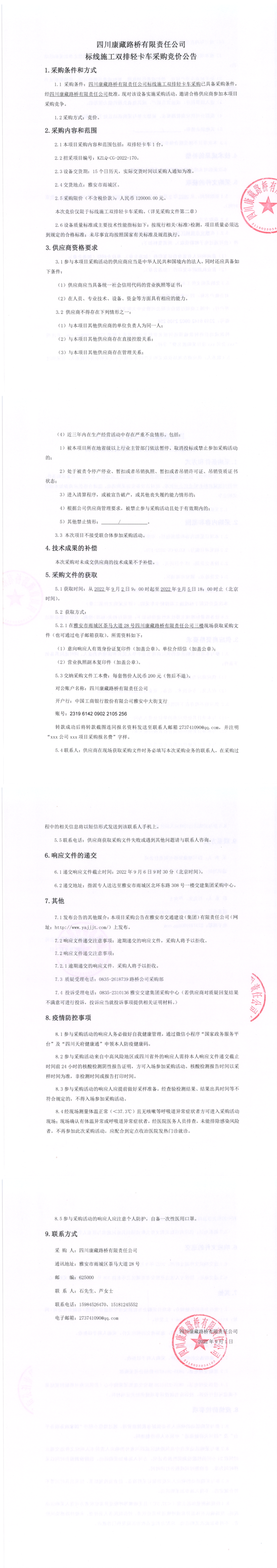 四川康藏路橋有限責(zé)任公司標(biāo)線施工雙排輕卡車采購(gòu)競(jìng)價(jià)公告