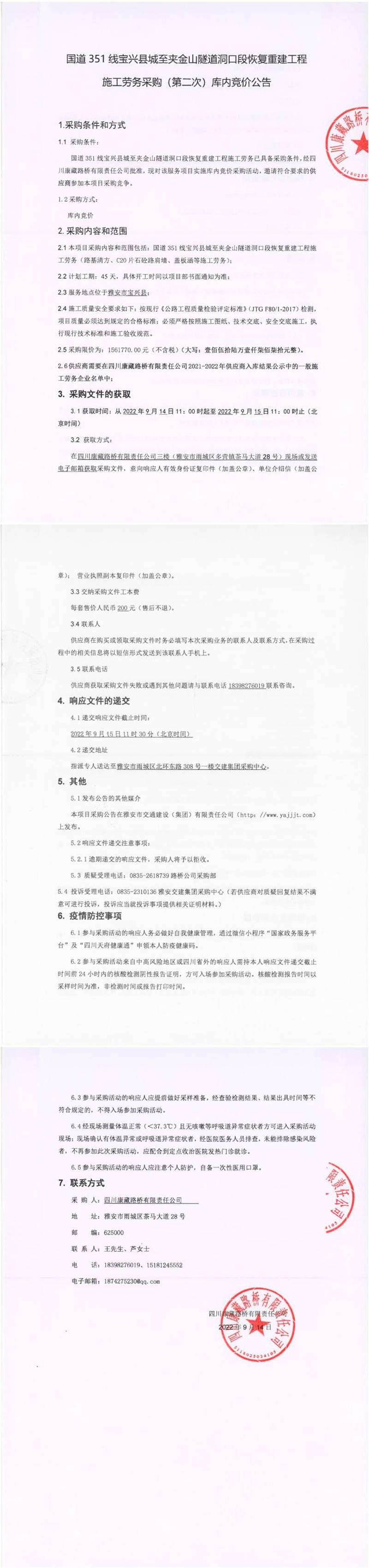 四川康藏路橋有限責(zé)任公司國(guó)道351線寶興縣城至夾金山隧道洞口段恢復(fù)重建工程施工勞務(wù)采購(gòu)(第二次)庫(kù)內(nèi)競(jìng)價(jià)公告