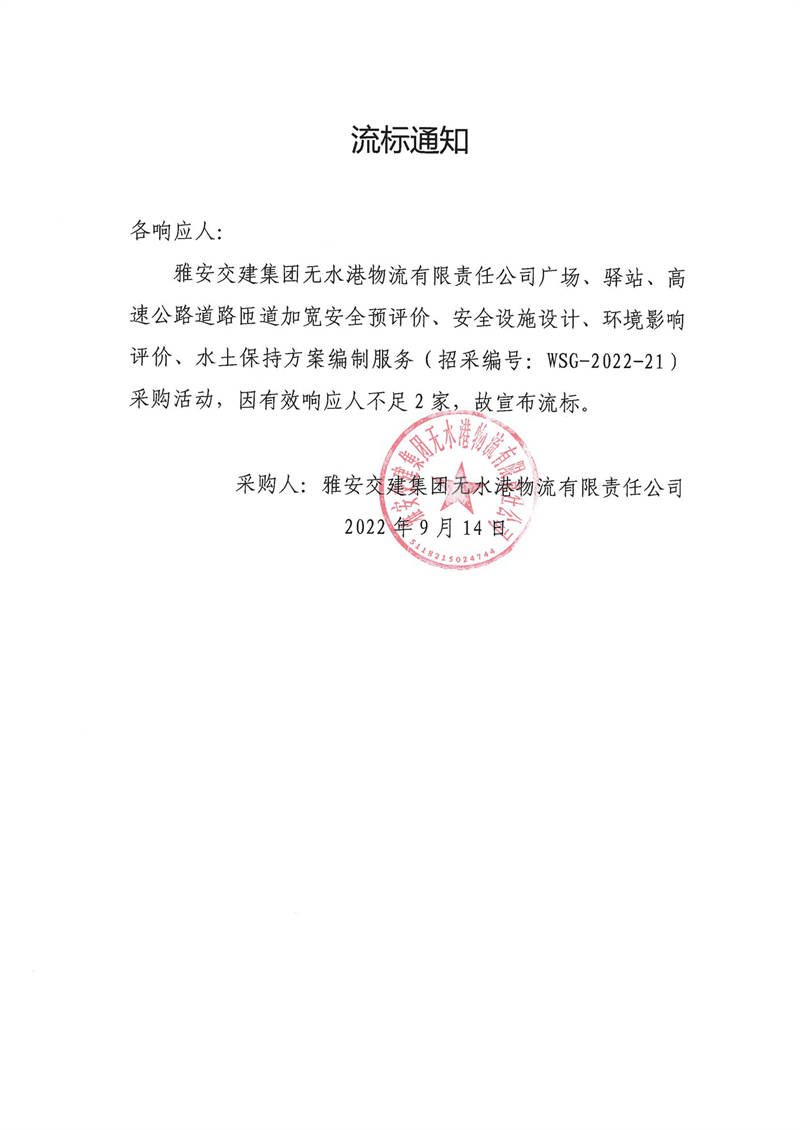 雅安交建集團(tuán)無水港物流有限責(zé)任公司廣場(chǎng)、驛站、高速公路道路匝道加寬安全預(yù)評(píng)價(jià)、安全設(shè)施設(shè)計(jì)、環(huán)境影響評(píng)價(jià)、水土保持方案編制服務(wù)采購(gòu)流標(biāo)通知