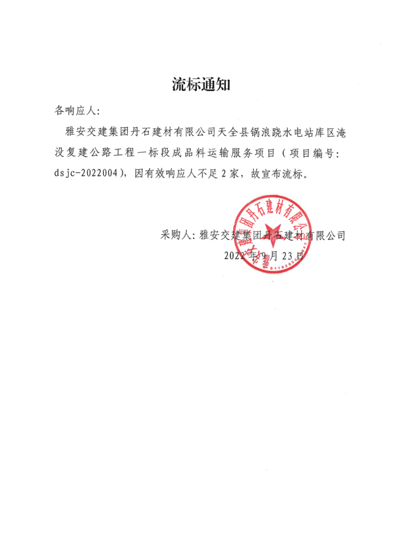 雅安交建集團丹石建材有限公司天全縣鍋浪蹺水電站庫區(qū)淹沒復(fù)建公路工程一標(biāo)段成品料運輸服務(wù)項目流標(biāo)通知