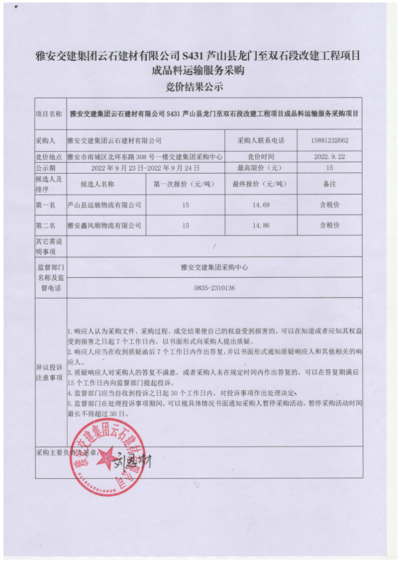 雅安交建集團(tuán)云石建材有限公司S431蘆山縣龍門至雙石段改建工程項(xiàng)目成品料運(yùn)輸服務(wù)采購競(jìng)價(jià)結(jié)果公示
