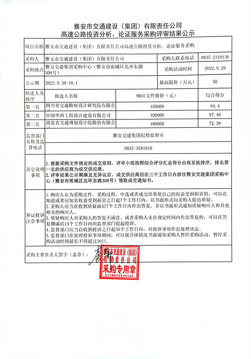 雅安市交通建設(shè)(集團(tuán))有限責(zé)任公司高速公路投資分析、論證服務(wù)采購評審結(jié)果公示