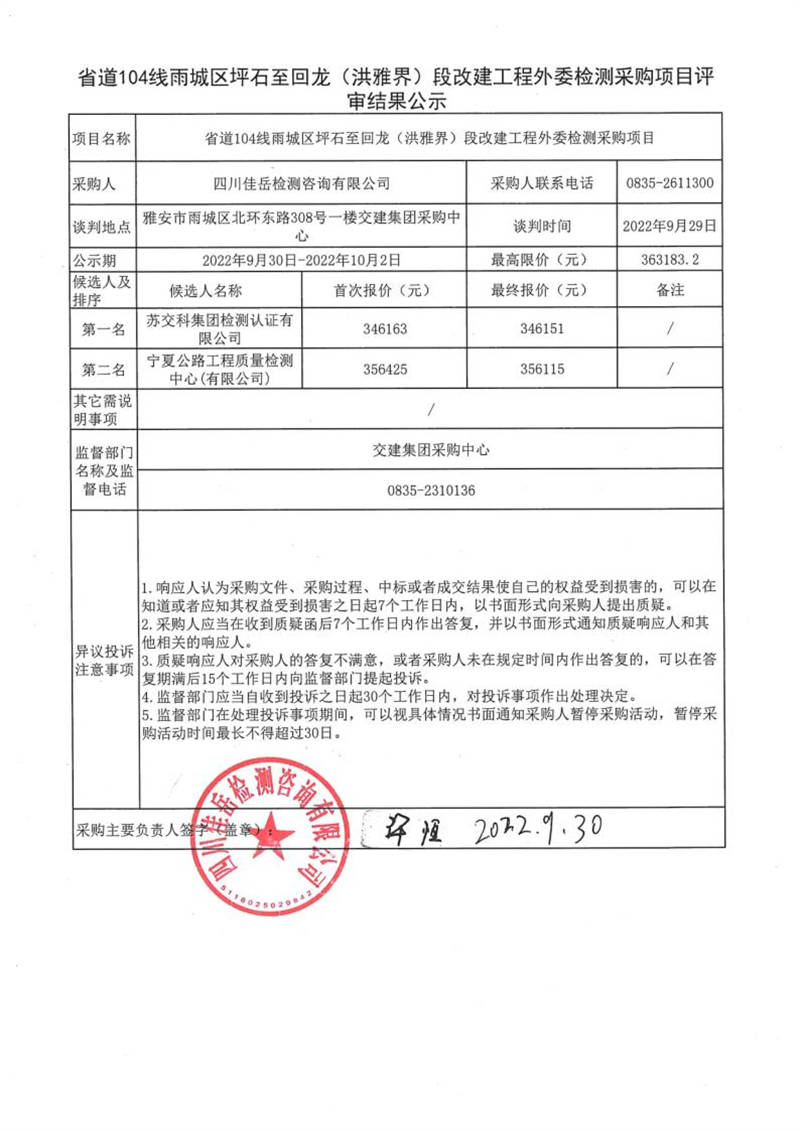 四川佳岳檢測(cè)咨詢(xún)有限公司省道104線雨城區(qū)坪石至回龍(洪雅界)段改建工程外委檢測(cè)采購(gòu)項(xiàng)目評(píng)審結(jié)果公示
